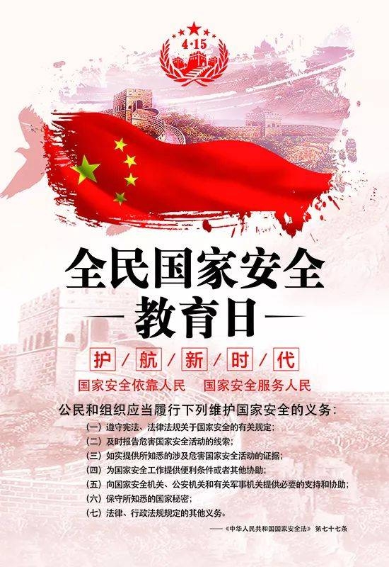 2015年7月1日,全国人大常委会通过的国家安全法规定,国家加强国家安全新闻宣传和舆论引导,通过多种形式开展国家安全宣传教育活动,将国家安全教育纳入国民教育体系和公务员教育培训体系,增强全民国家安全意识,每年4月15日为全民国家安全教育日。