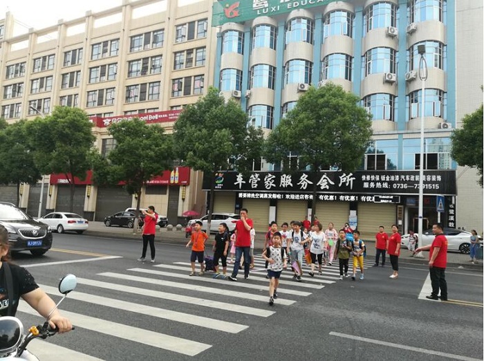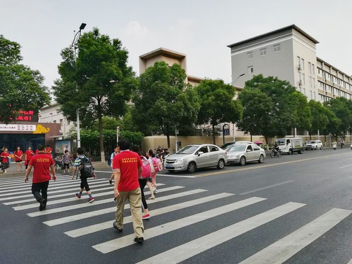 志愿者们在民警带领下,利用口哨和交通手势,引导车流与人流间隔通行,劝导交通违法行为,维护道路交通秩序,保护学生安全过马路。对横穿马路的行人进行口头教育,提示骑自行车的学生不要在路上追逐打闹,按交通信号灯安全通行。同时,提醒家长接送孩子时要将车辆停放在指定地点,引导学生家长遵守交规、文明出行,为师生出行打造良好的道路交通环境。